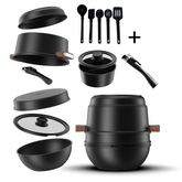 - Koekenpan 25,5 cm en 1,7 L, soeppan 29 cm en 6,1 L, sauspan 20cm en 2,1 L grillpan 29 cm en 2,5 L, universele deksel 20 cm die op de soeppan, wokpan en grillpan past, wokpan 29 cm en 4,8 L en twee afneembare handvatten.